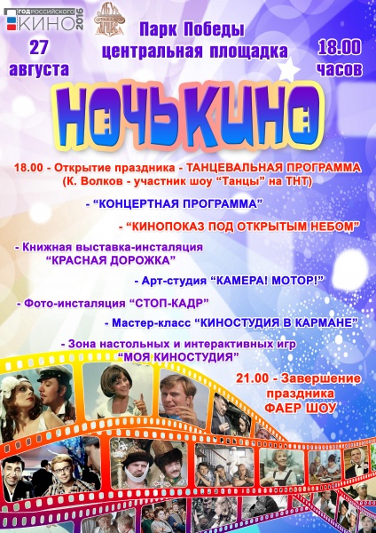 В этот день и ночь в районах края пройдёт более 200 мероприятий: показы фильмов, концертные программы, кино выставки, экскурсии и многое другое. Во время акции «Ночь кино», в городском Дворце культуры зрители смогут увидеть фильмы «Легенда №17» Николая Лебедева, «Батальонъ» Дмитрия Месхиева и анимационную ленту «Смешарики. Легенда о золотом драконе» Дениса Чернова. Мы надеемся, что акция «Ночь кино» будет интересна зрителям всех возрастов, которые получат возможность посмотреть любимые российские фильмы, причем на открытых площадках, что очень важно в летнее время - отметил методист массового отдела городского Дворца культуры Дмитрий ЯРКИН.
