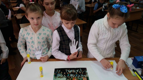 Размышляли, анализировали, отвечая на вопросы, решали, почему это понятие так важно сегодня. Выполняли задание: на импровизированное солнышко клеили лучики, на которых написаны качества толерантного человека, читали стихи, высказывания известных людей на эту тему. Обведя собственную ладонь на листе бумаги, школьники на пальчиках написали свои хорошие черты, а на ладони обозначили те черты, которые хотели бы приобрести. Из ладошек получился «цветок толерантности», а в центре - фотография класса.