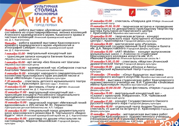 Администрация Ачинска приглашает жителей и гостей нашего города ознакомиться с культурными мероприятиями и событиями на октябрь.
