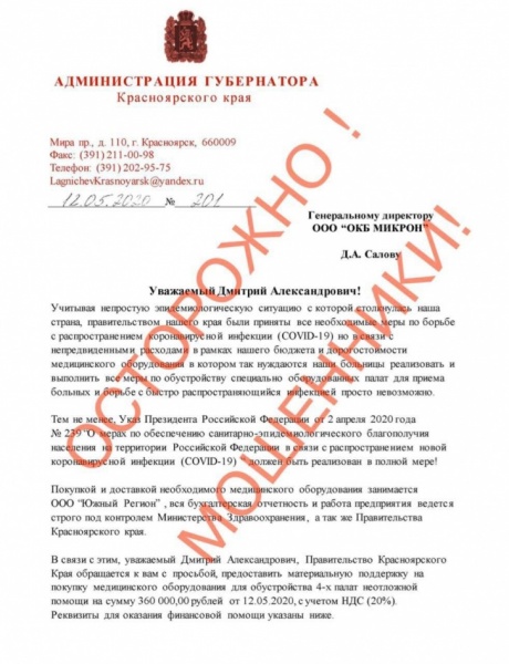 Деньги предлагают перевести на счет частной фирмы, которая якобы закупает оборудование под контролем властей. В правительстве края просят не доверять подобным письмам и запрашивать подтверждения напрямую у всех, кто обращается за такой помощью.