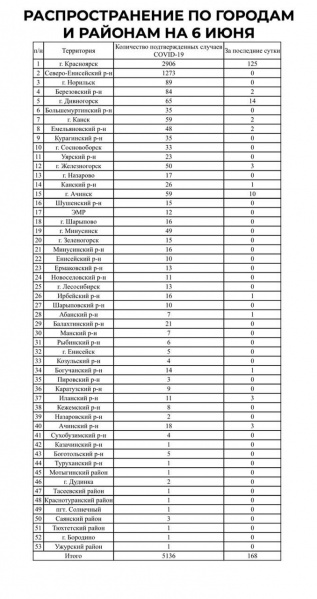 На 14.00 часов 06.06.2020 г. в Красноярском крае зарегистрировано всего 5136 лабораторно подтвержденных случаев заболевания COVID-19 на 53 территориях края, в том числе за последние сутки зарегистрировано 168 случаев заболевания.
