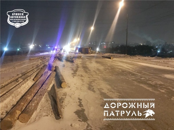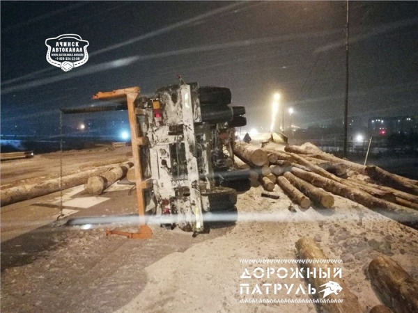 Перевернувшийся грузовик с бревнами перекрыл въезд в Ачинск