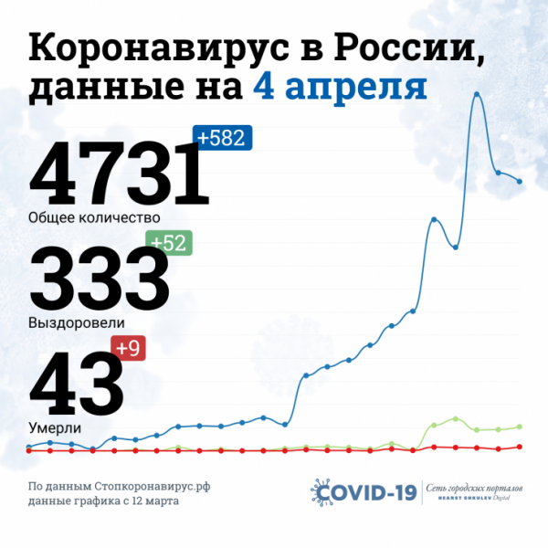 По данным оперативного штаба по борьбе с коронавирусом, за последние сутки в России инфекцию обнаружили у 582 человека. 434 из них находятся в Москве. Всего на сегодняшний день в стране насчитывается 4731 заразившийся. 333 из них выздоровели, 43 — скончались. За последние сутки из-за коронавируса в России умерли 9 человек.