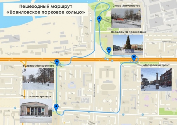 Маршрут, по проекту, проходит через сквер Энтузиастов, площадь перед ТЦ «Красноярье», сквер «Московский тракт», соединяется с ТЮЗом и бульваром Маяковского через Вавилова и уходит на набережную. Этот участок после благоустройства войдет в так называемое «Вавиловское парковое кольцо».