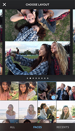 С помощью Layout можно создавать различные коллажи, а поиск фотографий для них возможен, например, благодаря функции «Лица» (Faces): приложение способно найти все изображения из галереи пользователя, на которых есть люди.