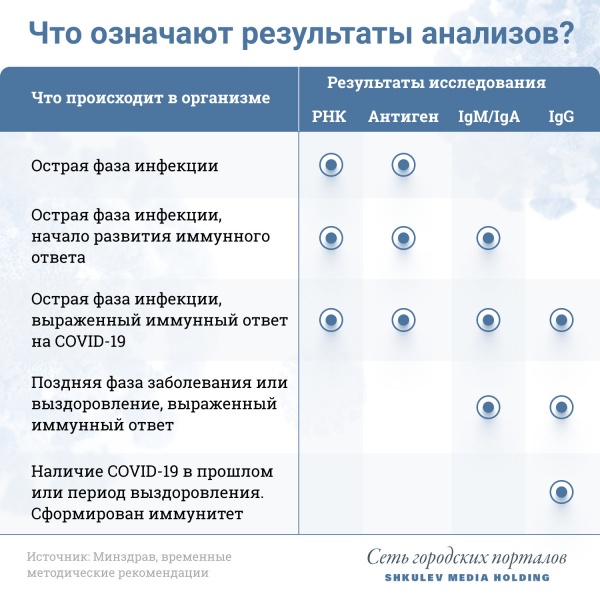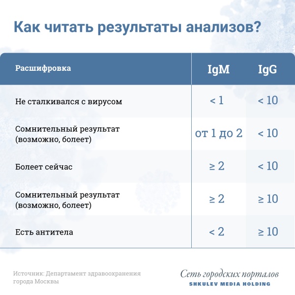 В памятке, которую Департамент здравоохранения города Москвы выпустил для желающих сдать тесты на антитела, говорится, что небольшое количество IgM можно читать как «сомнительный» результат. Если IgM от 1 до 2, а IgG меньше 10, то это говорит о том, что вирус может находиться в организме и пациент переносит инфекцию бессимптомно.